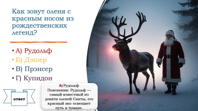 Для проверки нажимается кнопка «Ответ» — на экране появляется правильный вариант и краткое пояснение.