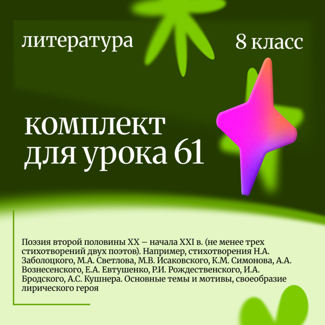 Скачайте комплект и помогите восьмиклассникам открыть для себя поэзию, которая заставляет задуматься о человеческом достоинстве, памяти и красоте.