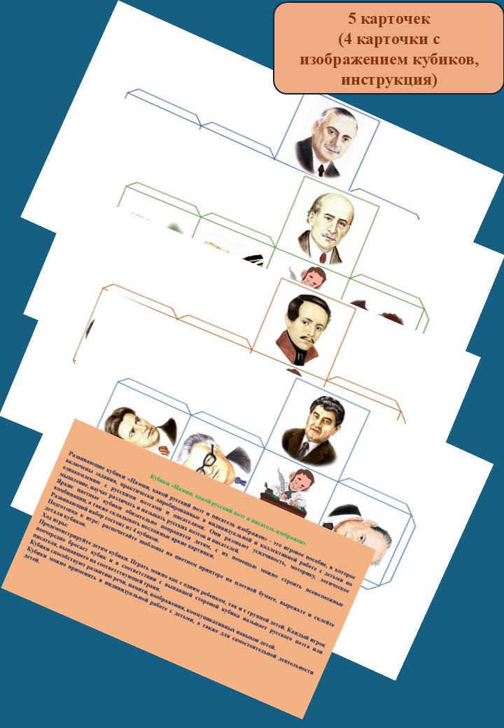 Развивающий набор состоит из 4 кубиков. В каждом кубике есть 6 сторон с картинками портретов русских поэтов и писателей.