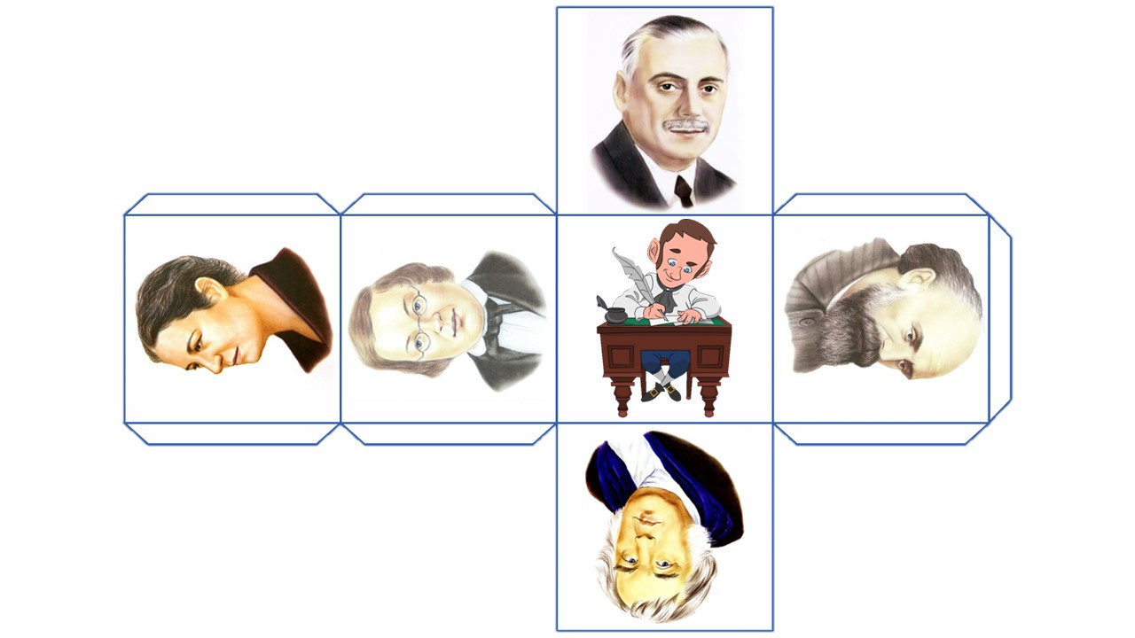 Продемонстрируйте детям кубики. Играть можно как с одним ребенком, так и с группой детей. Каждый игрок поочередно бросает кубик и в соответствии с выпавшей стороной кубика называет русского поэта или писателя, выпавшего на соответствующей грани.