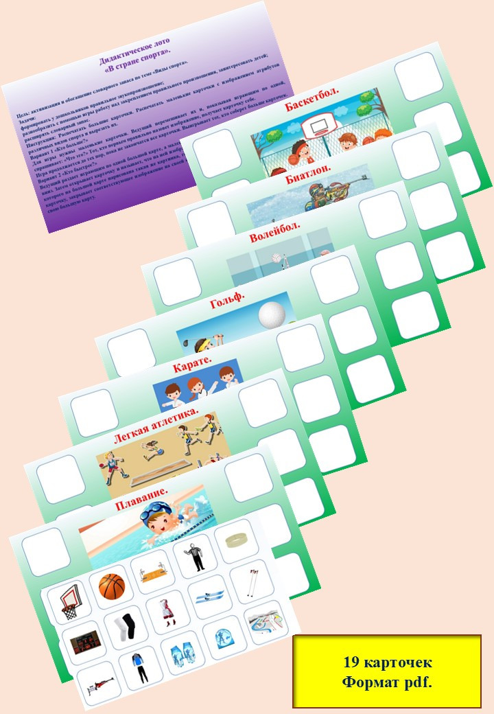 Инструкция: Распечатать большие карточки. Распечатать маленькие карточки с изображением атрибутов различных видов спорта и вырезать их.
