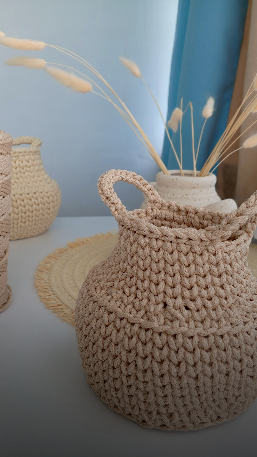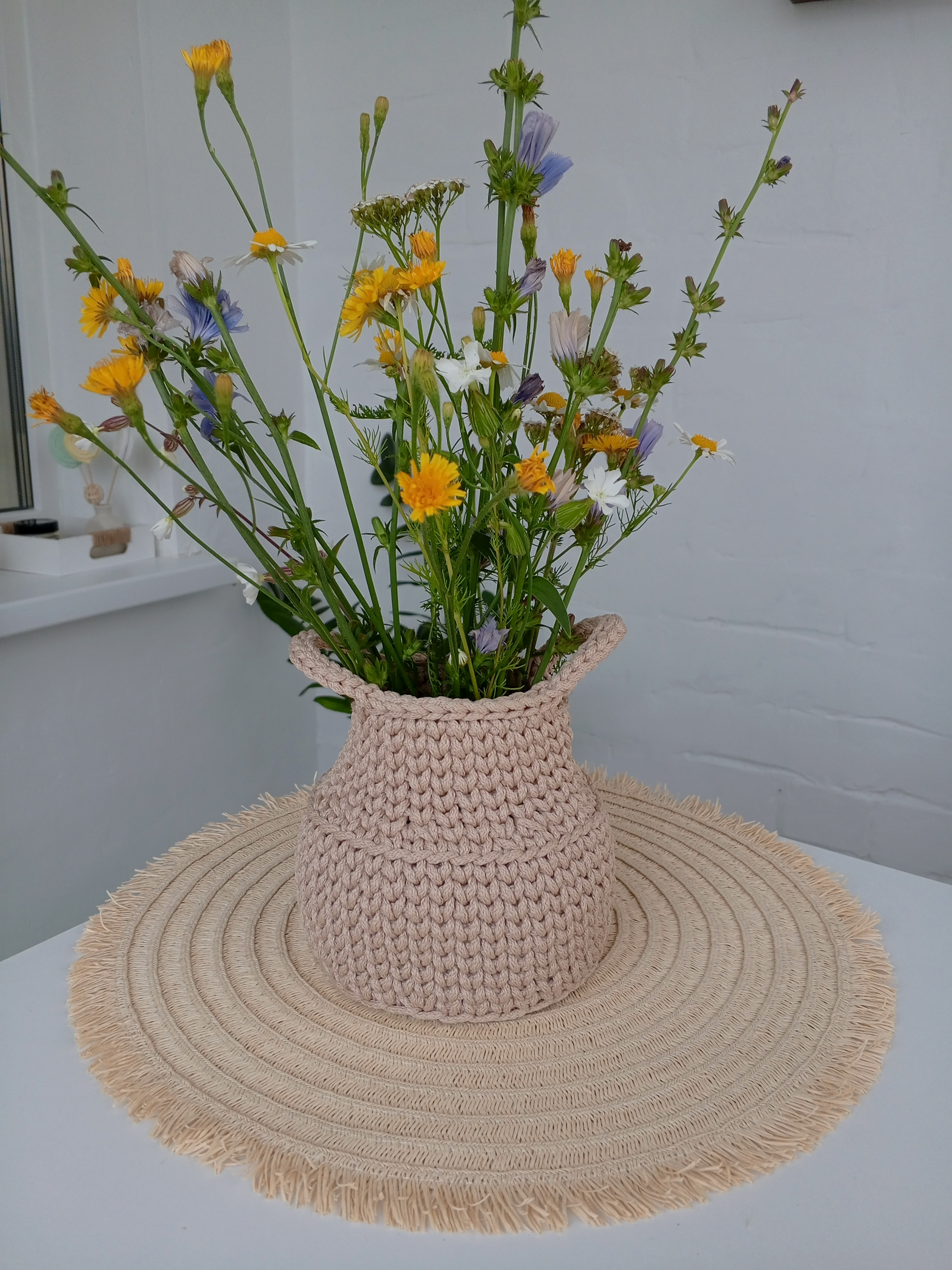 Бидончик выполнен из полиэфирного шнура.Легко очищается.Замечаткльно смотрится с сухоцветами,осенней листвой.