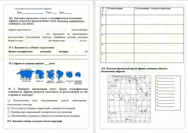 Методическая разработка: Рабочий лист "Физико-географическое положение Африки" для 7 класса