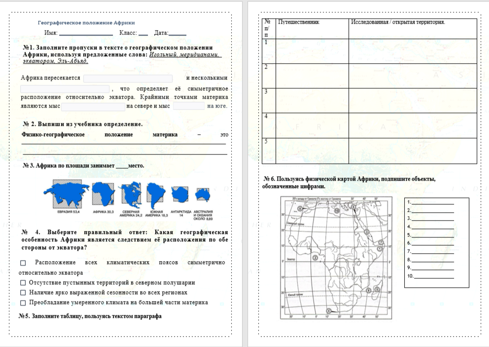 Цель рабочего листа — помочь ученикам систематизировать знания о географическом положении, природных условиях и ресурсах континента, а также развить навыки анализа и работы с географической информацией.