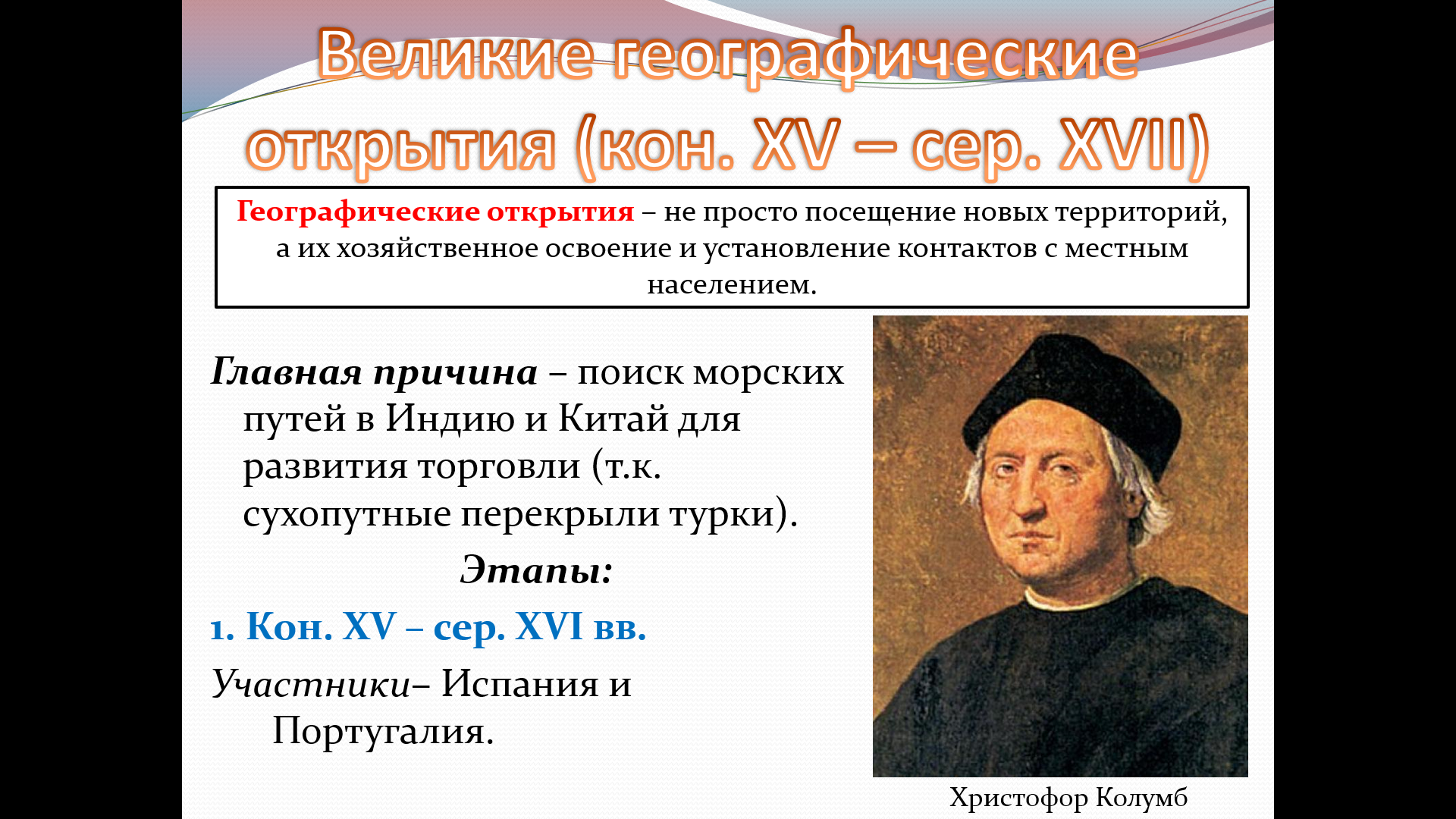 Эта презентация открывает тему Великих географических открытий и знакомит учащихся с миром на рубеже XV-XVI веков. Материал раскрывает причины поиска новых морских путей, этапы открытий, роль Испании и Португалии, а также участие России в географических исследованиях.