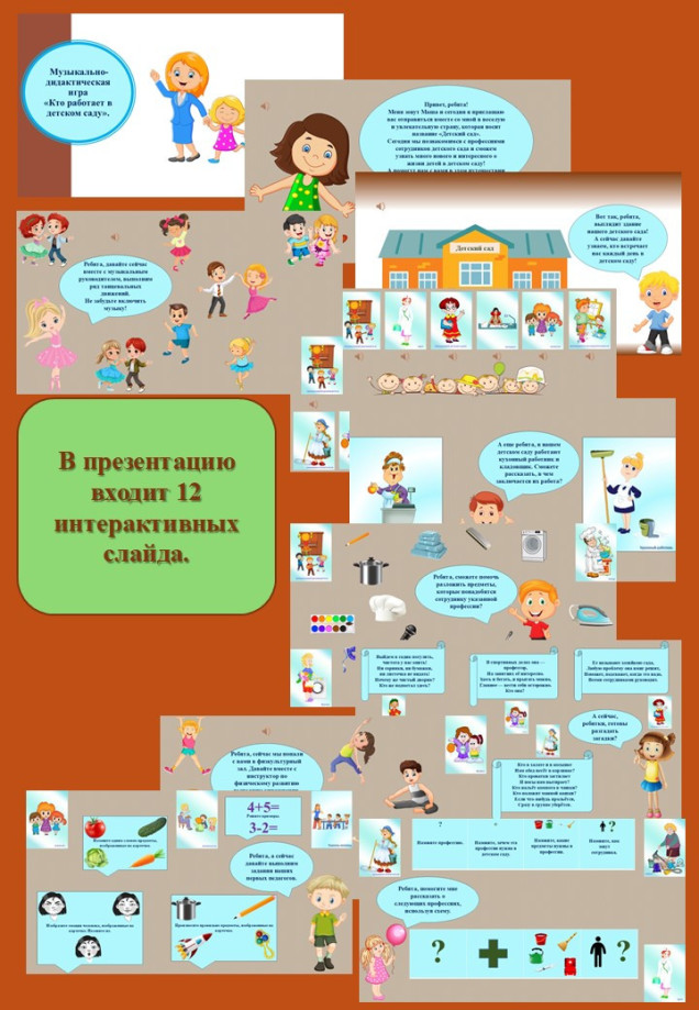 Также музыкально-интерактивная игра "Кто работает в детском саду" поможет создать праздничную обстановку для понимания детьми значения даты, связанной с праздником "День дошкольного работника".