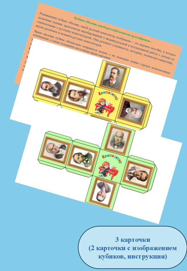 Развивающий набор состоит из 2 кубиков. В каждом кубике есть 6 сторон с картинками портретов русских композиторов.