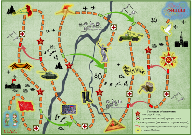 Игра-ходилка "Символы Победы"— это не только способ организации увлекательного детского досуга, но и — прекрасное развивающее средство, способствующее формированию интеллектуальных способностей, различных психических функций и навыков.