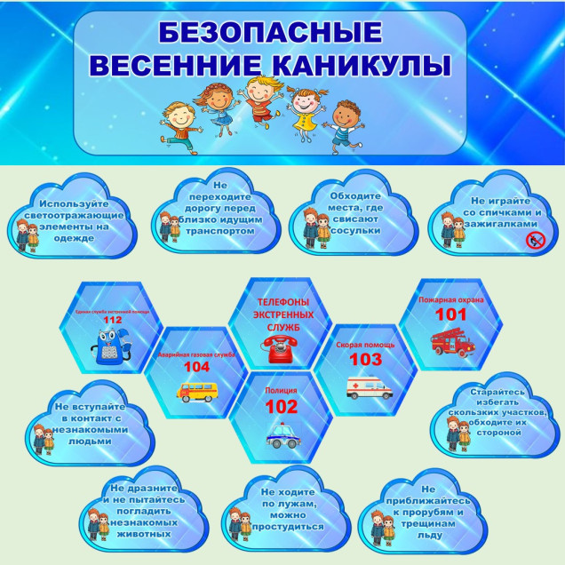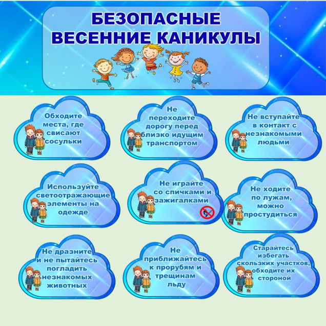Весенние каникулы — пора пробуждения природы, когда воздух наполнен свежестью, а дни становятся всё теплее. Чтобы праздник остался приятным и безопасным, необходимо помнить основные правила поведения на улице. Доска «Безопасные весенние каникулы» — наглядное напоминание о том, как весело провести время, сохранив здоровье и безопасность.