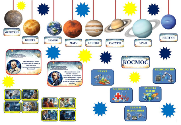 Оформление поможет педагогам начальных классов и средней школы в проведении мероприятий, посвящённых Дню космонавтики.