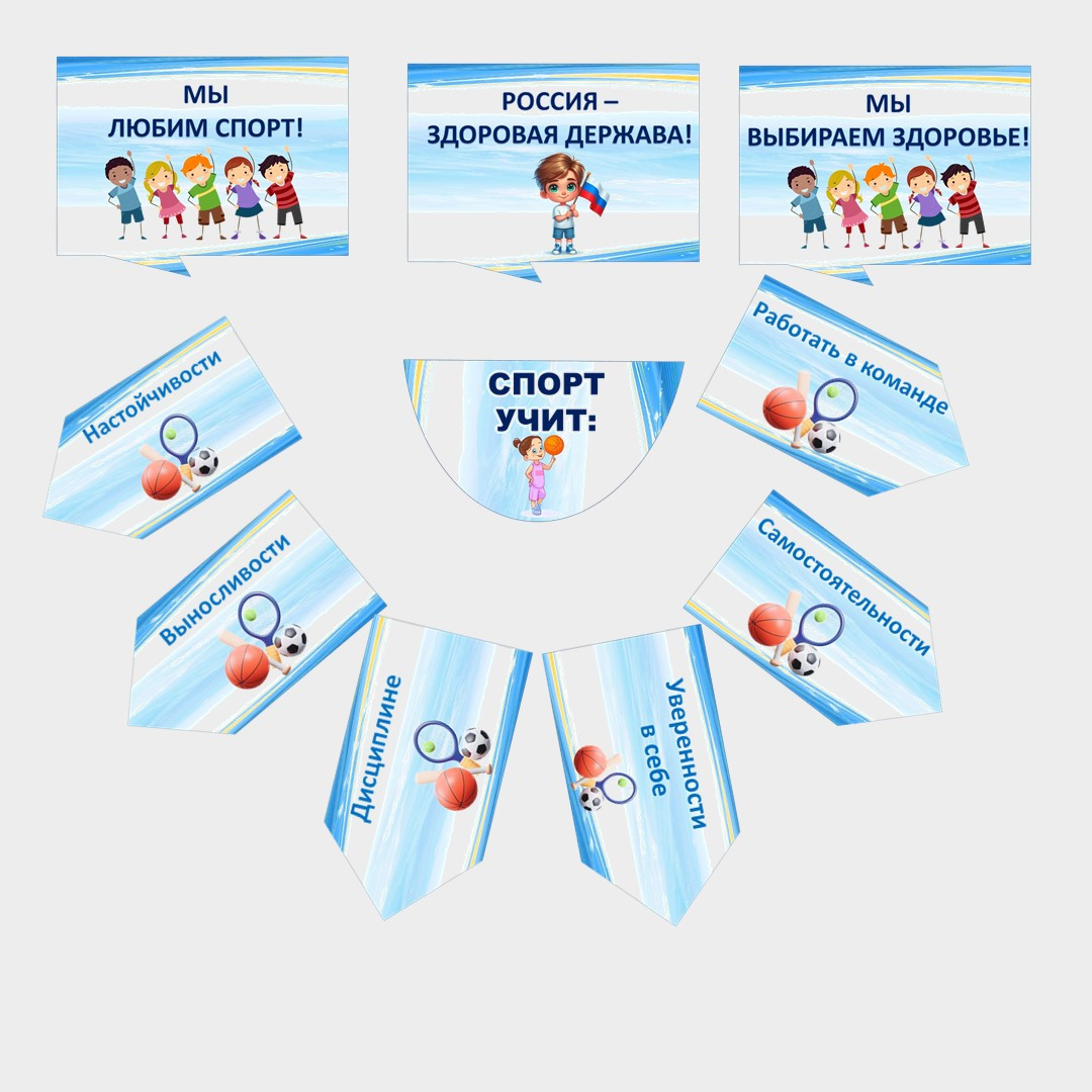Динамичный и яркий набор для декора классной комнаты, спортивной зоны или школьного стенда к Дню физической культуры. Комплект способствует формированию у учащихся привычки к активному образу жизни, развитию интереса к спорту и регулярным физическим упражнениям.