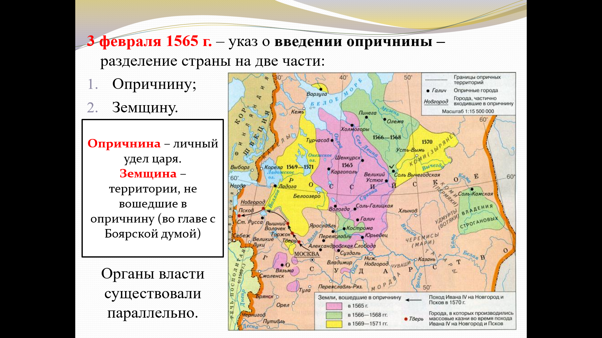 Понятийный аппарат: Введение и отработка ключевых понятий (опричнина, земщина, опричник, заповедные лета).