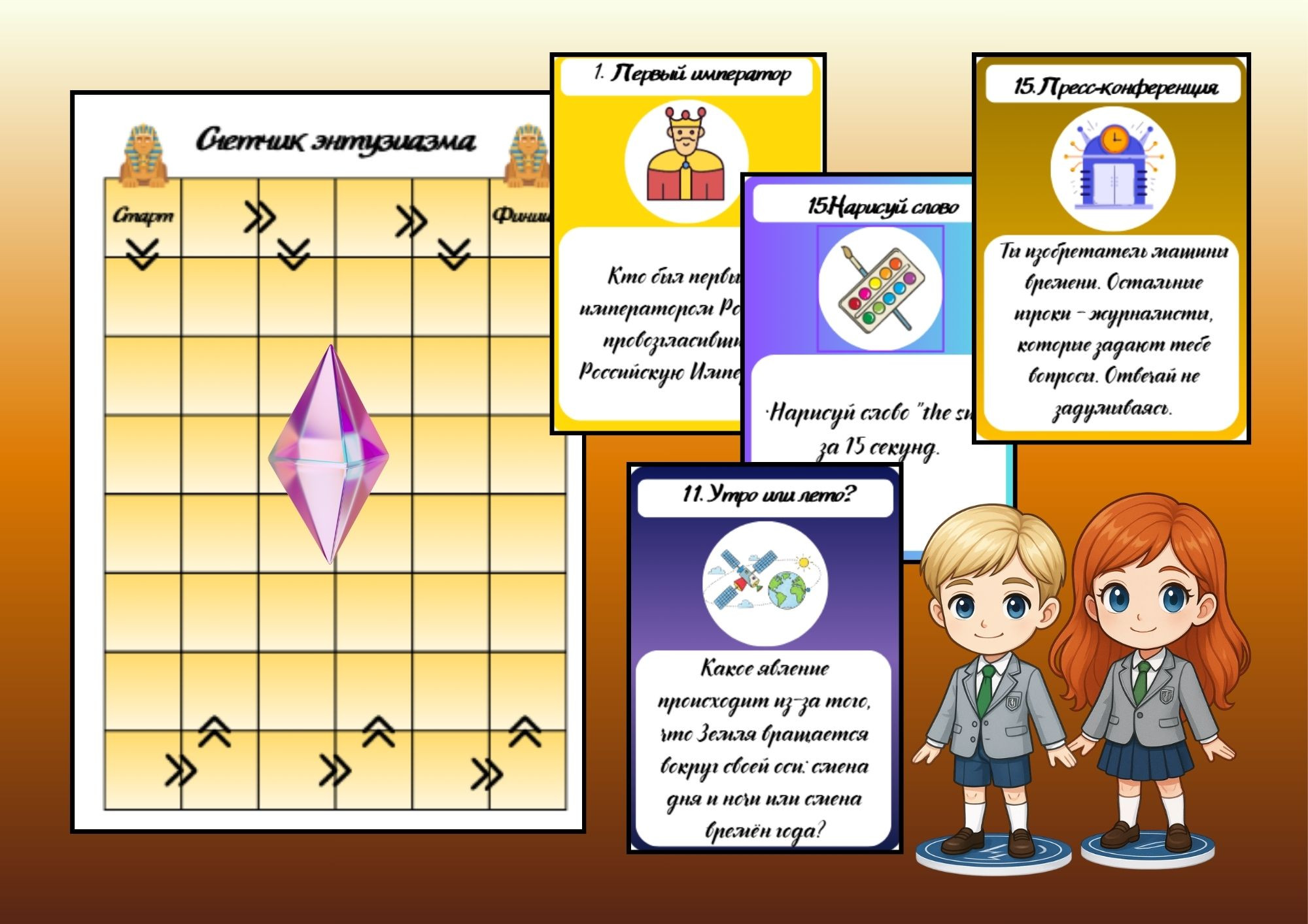 Целевая аудитория: Дети 8-15 лет. Количество игроков: от 2 до 6 или от 2 до 4 команд. Подходит для большого количества участников. Средняя продолжительность партии: 30-45 минут. Концепция и цель игры: Древний Сфинкс, хранитель знаний, погрузился в сон из-за того, что люди перестали интересоваться науками. Его сердце — "Кристалл Мудрости" — раскололось на фрагменты и разлетелось по разным уголкам Острова Знаний. Игрокам предстоит отправиться в путешествие, чтобы собрать осколки кристалла, ответив на вопросы Сфинкса и выполняя задания. Тот, кто внесет наибольший вклад в пробуждение Сфинкса, станет новым Хранителем Знаний. Главная цель — не просто победить, а показать, что сам процесс получения знаний — это увлекательное приключение. Компоненты игры: 1. Игровое поле: Карта Острова Знаний, разделенная на 6 разноцветных регионов (Лес Гуманитарных Наук, Горы Математики, Река Естествознания, Долина Творчества, Иностранное небо, Пустыня Истории). В центре — спящий Сфинкс. (в 3-х разных форматах для распечатывания А4, А3 и А2) 2. Карты заданий (6 колод по цветам регионов) всего 96 шт + рубашки * Лес Гуманитарных Наук: Задания на грамотность, рифмы, синонимы, составление коротких рассказов по картинке 16 шт * Горы Математики: Нескучные задачки на логику, головоломки, задания на пространственное мышление 16 шт * Река Естествознания: Вопросы о природе, животных, простых физических явлениях ("Почему листья зеленые?") 16 шт * Долина Творчества: Задания "нарисуй за 30 секунд", "изобрази пантомимой", "придумай новый способ использования предмета" 16 шт * Иностранное небо: Простые слова на перевод, задание "назови 5 цветов по-английски". (Задания можно легко адаптировать для другого языка или не использовать их , если в школе изучается другой язык). * Пустыня Истории: Задания на эрудицию "кто это был?", "расставь события по порядку" (например, изобретение колеса, телефона, интернета). 3. Жетоны "Осколки Кристалла": Разноцветные жетоны, соответствующие регионам. 4. Фишки игроков. 5. Кубик. 6. Счетчик "Энтузиазм" (общий для всех игроков). 7. Инструкция для ведущего 8. Ответы на задания