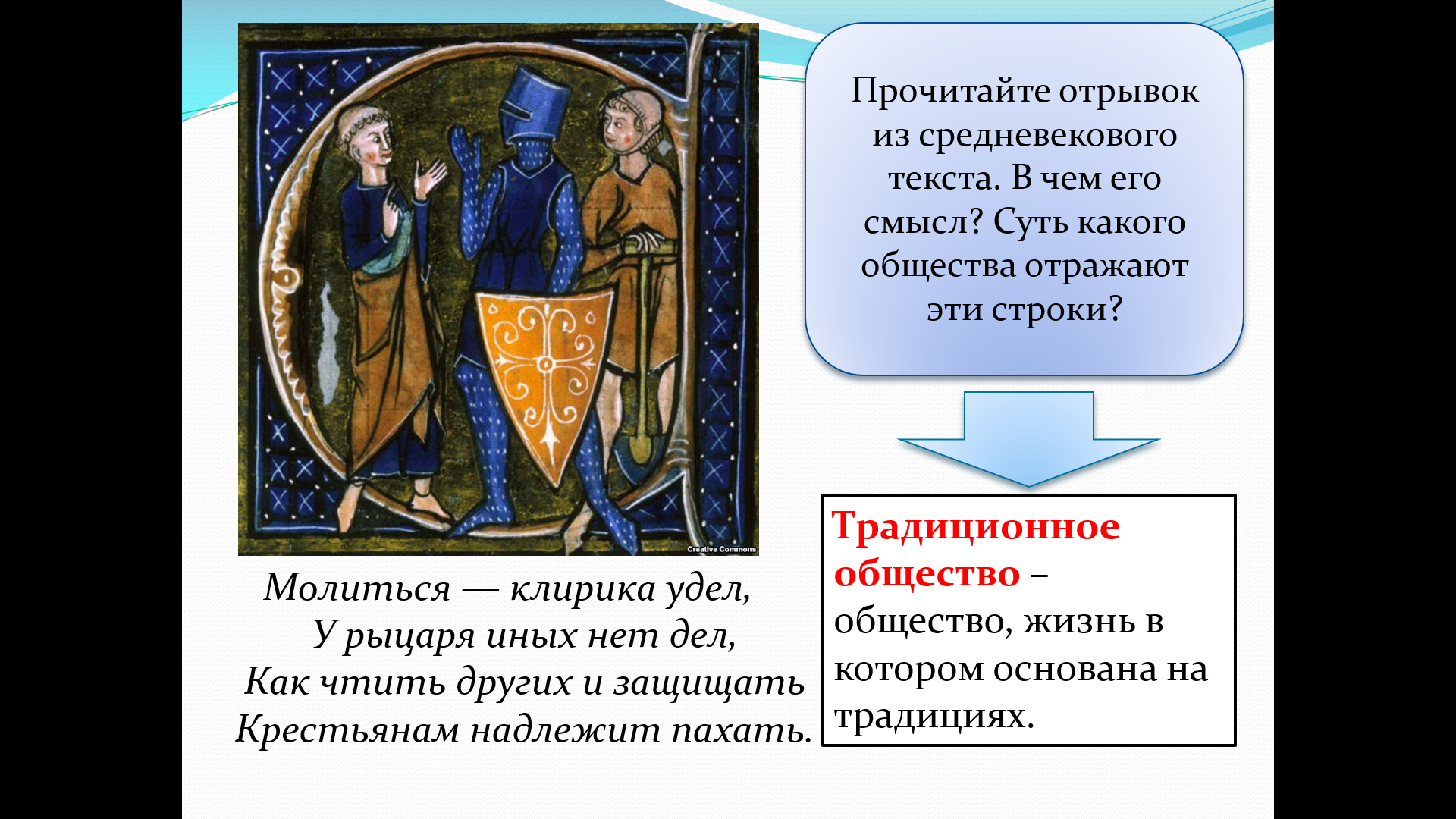 «Молиться — клирика удел, У рыцаря иных нет дел, Как чтить других и защищать, Крестьянам надлежит пахать.»