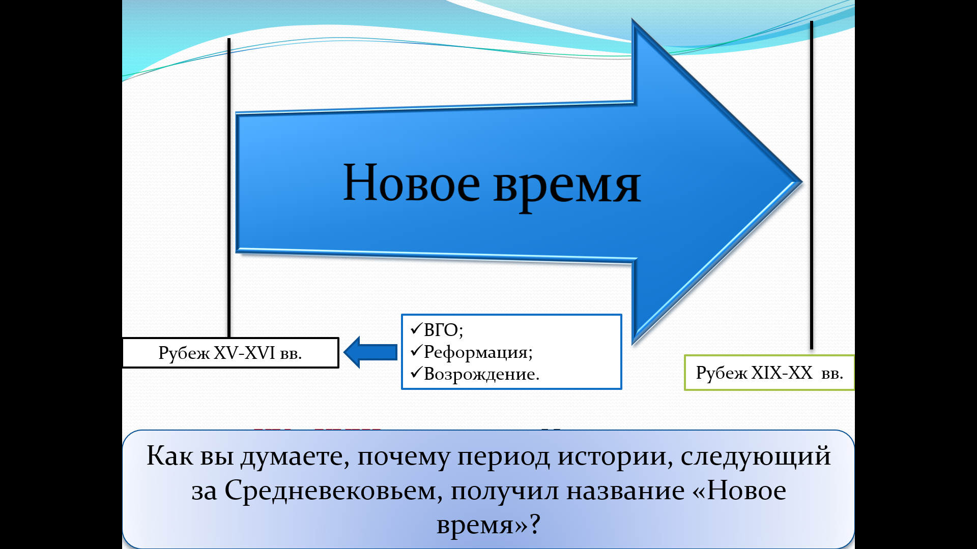 Проблемный подход: Главный вопрос презентации («Почему Новое время?») стимулирует познавательный интерес учащихся.