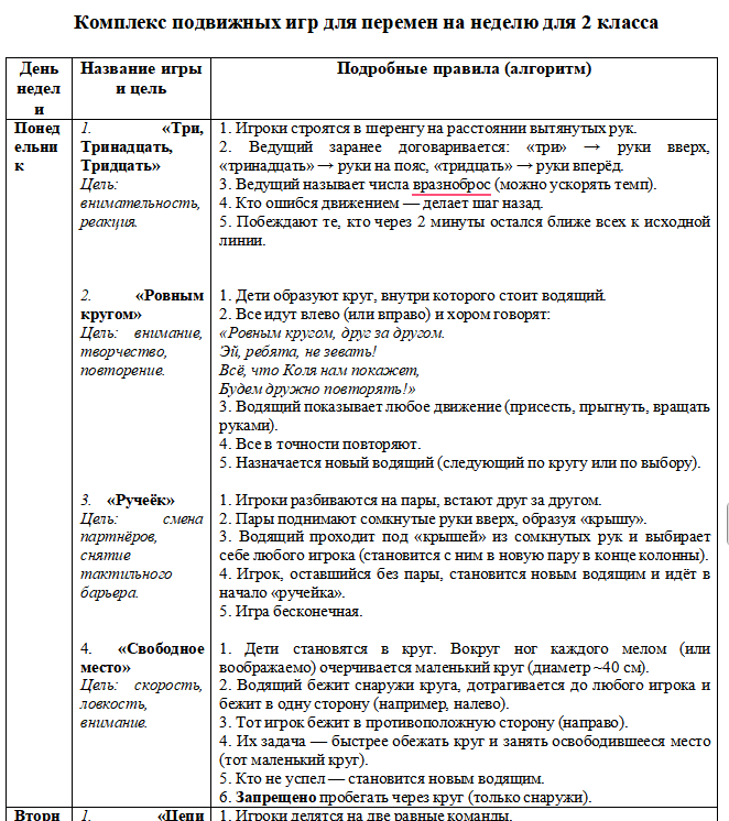 План на понедельник — пятница: Для каждого дня подобраны 4 игры, разные по интенсивности (от спокойных на внимание до активных).