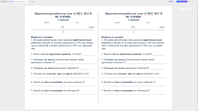 Практическая работа предназначена для отработки навыков счета лет в истории, определения последовательности событий и вычисления временных промежутков с использованием ленты времени.