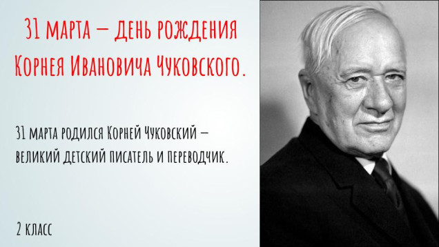 Презентация "31 марта - день рождения Корнея Чуковского". Цель урока: расширить представления о творчестве писателя. Сформировать читательский кругозор учащихся. Развивать речь, выразительность чтения, образное мышление, любознательность, воображение, творческие способности детей. Воспитывать дружелюбие, чувство товарищества, опрятность, послушание. Привить любовь к творчеству К. И. Чуковского и книге. Повысить интерес к произведениям К. И. Чуковского.