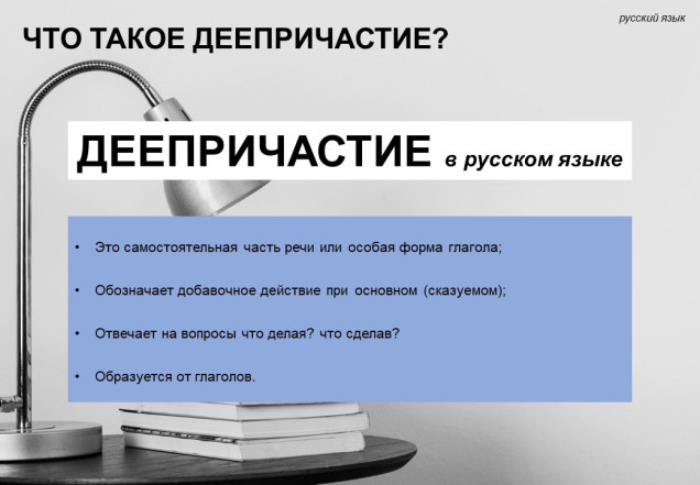 Данная презентация по теме "Деепричастие как часть речи. Деепричастный оборот" предназначена для уроков русского языка в 7 классе. В презентации представлено 14 слайдов с подробной информацией, которая поможет учителю познакомить учеников с новой темой. На слайдах представлена теория и два практических задания с ответами.