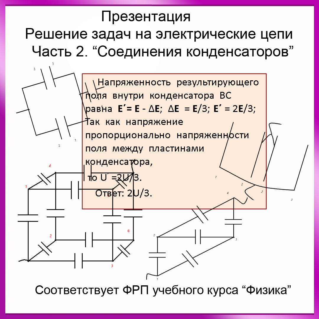 Презентация создана с целью оказания помощи учащимся в решении задач на «электрические цепи». Познакомившись с предложенным материалом, внимательно изучив его, можно приобрести навыки решения задач. Презентация содержит задачи с решениями по темам: «Соединения проводников», «Соединения конденсаторов», «Бесконечные цепочки». Все задачи сопровождаются чертежами, подробным решением и ответами. Есть задачи повышенной сложности. Материал может быть использован учителем на уроках, при подготовке к олимпиадам и экзаменам.