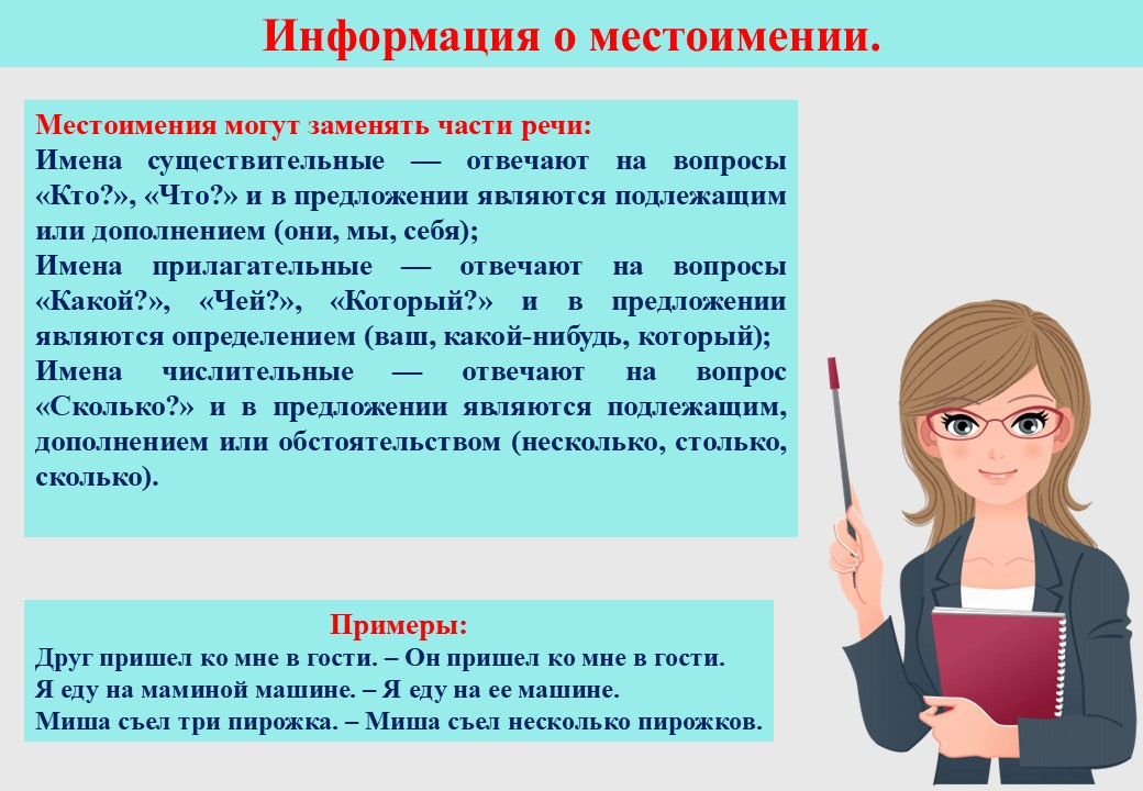 Цель: познакомить учащихся с местоимением как частью речи, его основными признаками и ролью в языке; сформировать умение находить местоимения в тексте и правильно употреблять их в устной и письменной речи.
