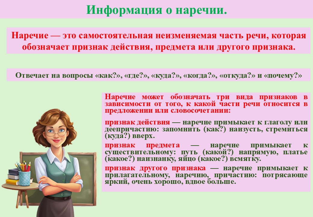 познакомить с основными признаками наречия (значение, вопросы, неизменяемость);
