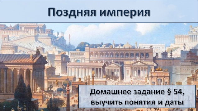 Презентация к уроку истории 5 класса на тему «Поздняя империя» (к учебнику В.Р.Мединского, А.О. Чубарьян). Презентация предназначена для изучения новой темы и закрепления знаний. Методическая разработка будет полезна учителям истории в качестве наглядного материала. Презентация включает в себя проверку знаний, полученных на предыдущем уроке, задания на актуализацию знаний, изучение и закрепление новой темы. Содержит интерактивные задания, что сделает урок более интересным для учеников.