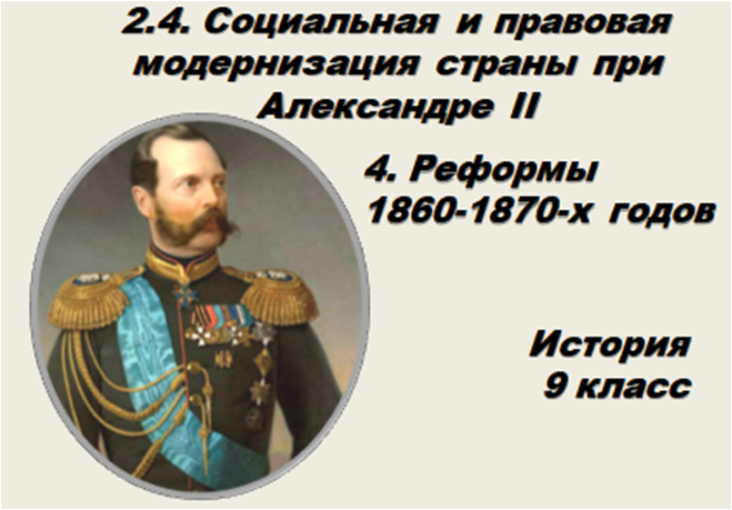Презентация для урока истории в 9 классе по учебнику В. Р. Мединского и А. В. Торкунова. Урок является четвёртым в изучение раздела 2.4. «Социальная и правовая модернизация страны при Александре II.»
