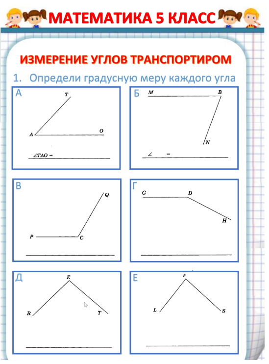 Рабочие листы к уроку "Измерение углов транспортиром" являются отличным материалом для изучения и отработки навыков работы с инструментом транспортиром на уроках математики 5 класса. Эти рабочие листы позволяют отрабатывать навыки определение углов, измерение углов, запись углов.