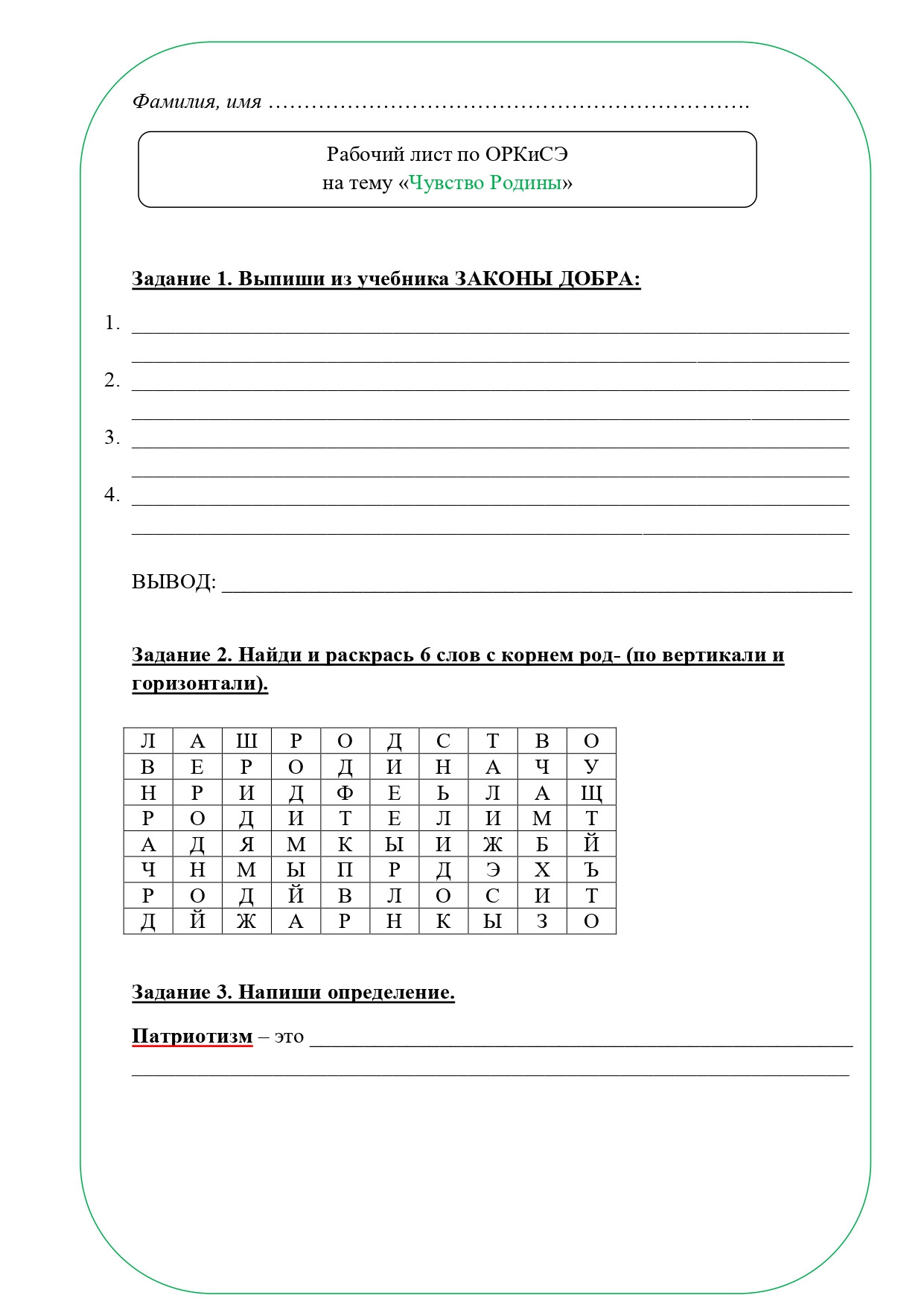 Рабочий лист по теме "Чувство Родины", ОРКСЭ, 4 класс. По учебнику А. И. Шемшуриной, модуль "Основы светской этики", 2014 год. Методическая разработка подойдет для учителей, преподающих курс ОРКСЭ в 4 классе начальной школы. Данный рабочий лист предназначен для организации деятельности учащихся на уроке, поможет лучше усвоить новый учебный материал или же проверить уровень усвоения материала. Рабочий лист может использоваться при повторении и обобщении изученного, усвоении нового материала и его закреплении. В рабочий лист включены различные типы заданий, помогающие школьникам усвоить основные моменты темы. Приложены ответы на задания. Рабочий лист "Чувство Родины" разработан в соответствии с темой урока.