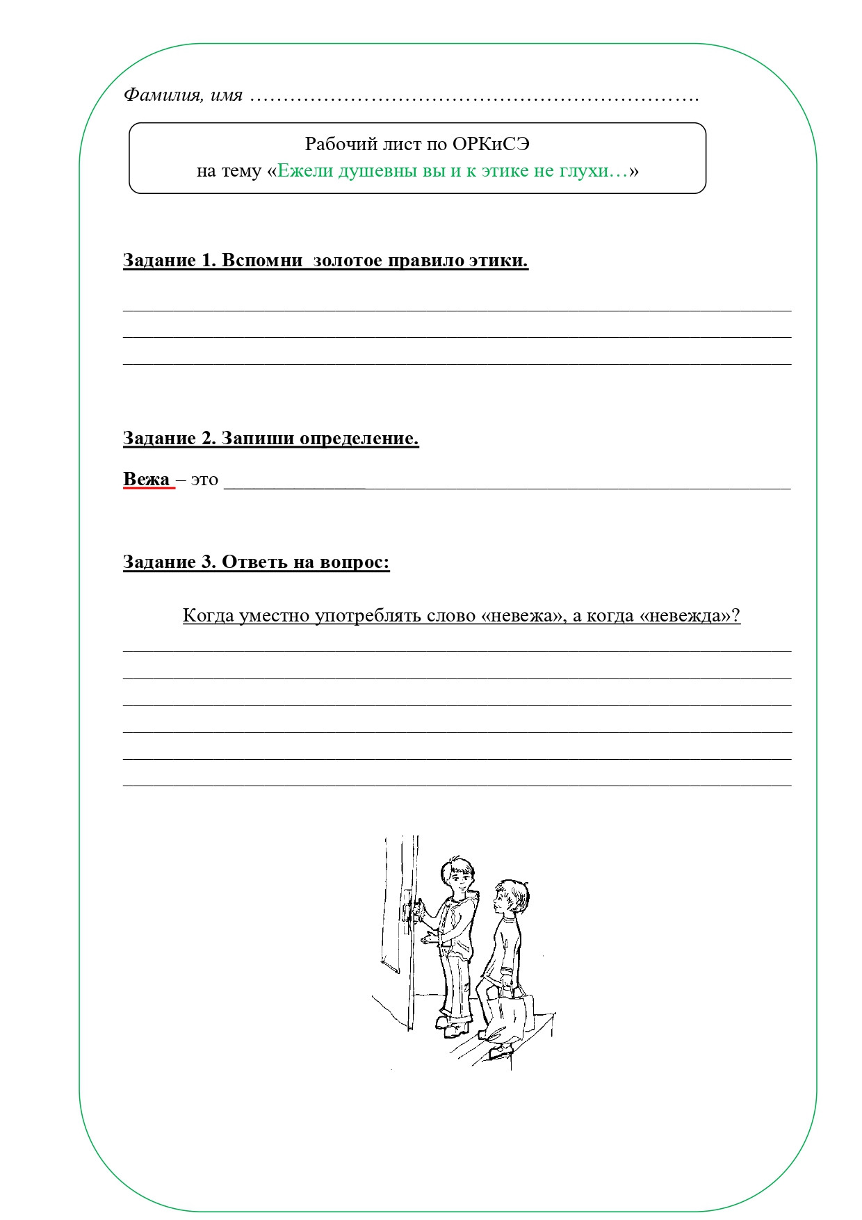 Рабочий лист по теме "Ежели душевны вы и к этике не глухи...", ОРКСЭ, 4 класс. По учебнику А. И. Шемшуриной, модуль "Основы светской этики", 2014 год. Методическая разработка подойдет для учителей, преподающих курс ОРКСЭ в 4 классе начальной школы. Данный рабочий лист предназначен для организации деятельности учащихся на уроке, поможет лучше усвоить новый учебный материал или же проверить уровень усвоения материала. Рабочий лист может использоваться при повторении и обобщении изученного, усвоении нового материала и его закреплении. В рабочий лист включены различные типы заданий, помогающие школьникам усвоить основные моменты темы. Приложены ответы на задания. Рабочий лист "Ежели душевны вы и к этике не глухи..." разработан в соответствии с темой урока.