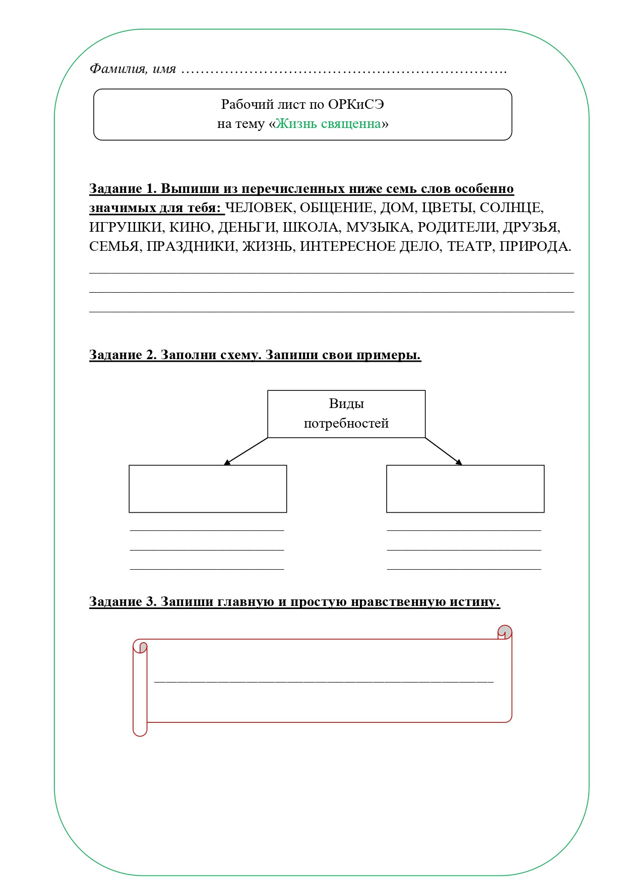 Рабочий лист по теме "Жизнь священна", ОРКСЭ, 4 класс. По учебнику А. И. Шемшуриной, модуль "Основы светской этики", 2014 год. Методическая разработка подойдет для учителей, преподающих курс ОРКСЭ в 4 классе начальной школы. Данный рабочий лист предназначен для организации деятельности учащихся на уроке, поможет лучше усвоить новый учебный материал или же проверить уровень усвоения материала. Рабочий лист может использоваться при повторении и обобщении изученного, усвоении нового материала и его закреплении. В рабочий лист включены различные типы заданий, помогающие школьникам усвоить основные моменты темы. Приложены ответы на задания. Рабочий лист "Жизнь священна" разработан в соответствии с темой урока.