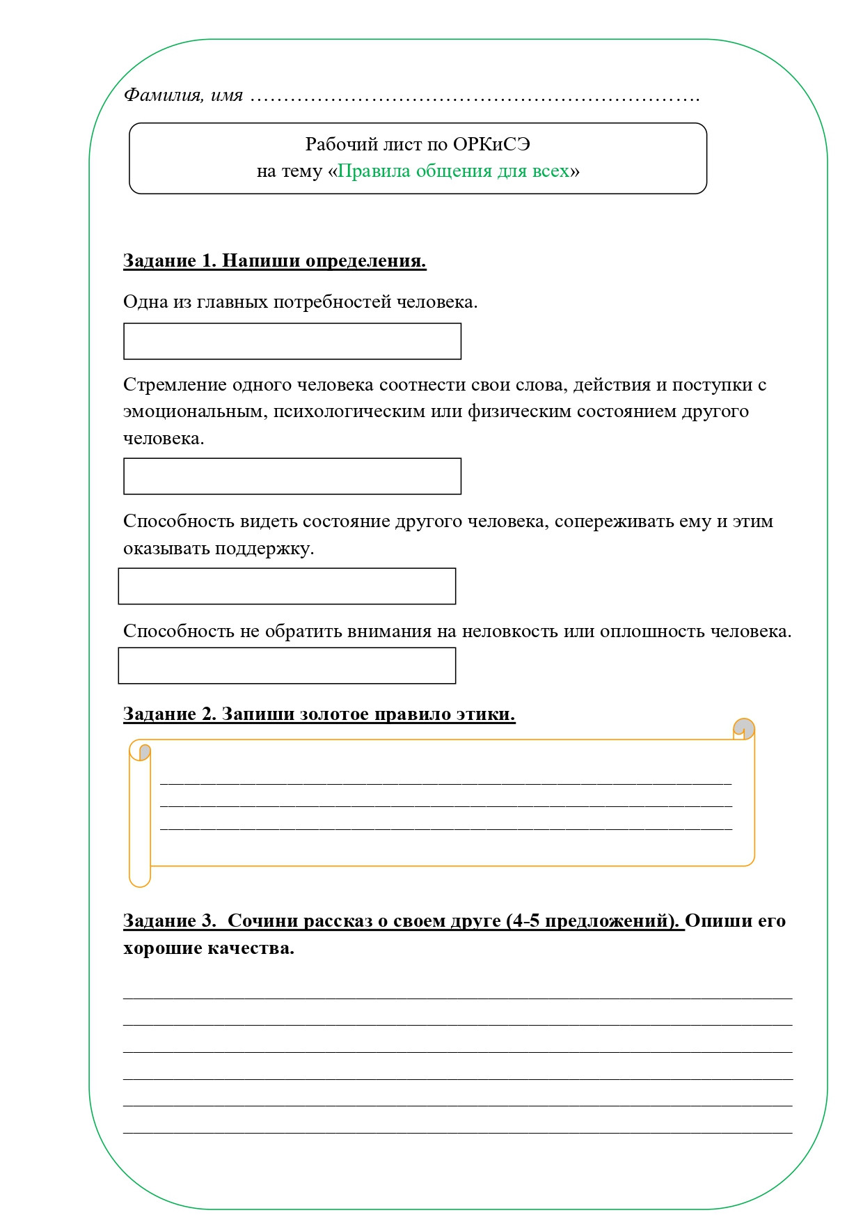 Рабочий лист по теме "Правила общения для всех", ОРКСЭ, 4 класс. По учебнику А. И. Шемшуриной, модуль "Основы светской этики", 2014 год. Методическая разработка подойдет для учителей, преподающих курс ОРКСЭ в 4 классе начальной школы. Данный рабочий лист предназначен для организации деятельности учащихся на уроке, поможет лучше усвоить новый учебный материал или же проверить уровень усвоения материала. Рабочий лист может использоваться при повторении и обобщении изученного, усвоении нового материала и его закреплении. В рабочий лист включены различные типы заданий, помогающие школьникам усвоить основные моменты темы. Приложены ответы на задания. Рабочий лист "Правила общения для всех" разработан в соответствии с темой урока.