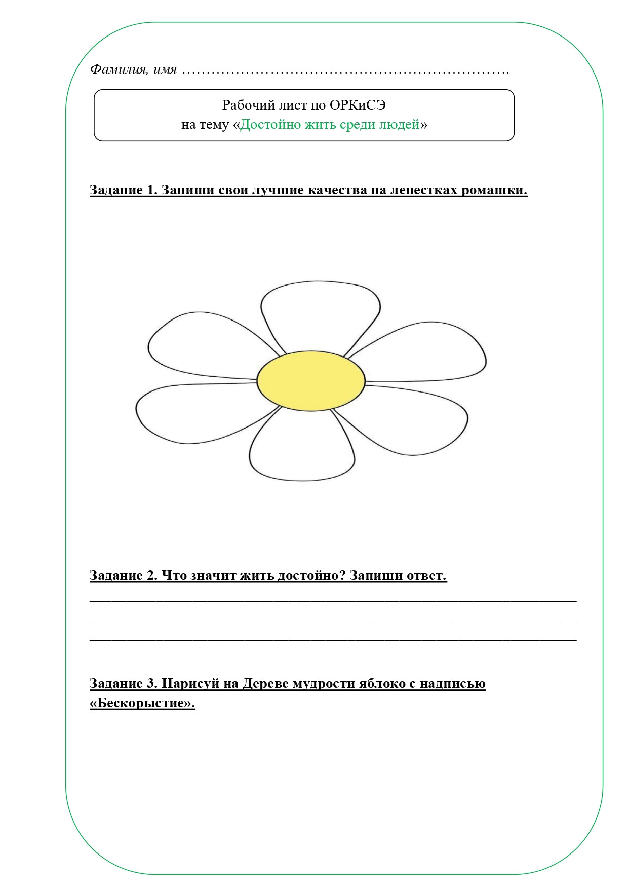 Рабочий лист по теме "Достойно жить среди людей", ОРКСЭ, 4 класс. По учебнику А. И. Шемшуриной, модуль "Основы светской этики", 2014 год. Методическая разработка подойдет для учителей, преподающих курс ОРКСЭ в 4 классе начальной школы. Данный рабочий лист предназначен для организации деятельности учащихся на уроке, поможет лучше усвоить новый учебный материал или же проверить уровень усвоения материала. Рабочий лист может использоваться при повторении и обобщении изученного, усвоении нового материала и его закреплении. В рабочий лист включены различные типы заданий, помогающие школьникам усвоить основные моменты темы. Приложены ответы на задания. Рабочий лист "Достойно жить среди людей" разработан в соответствии с темой урока.