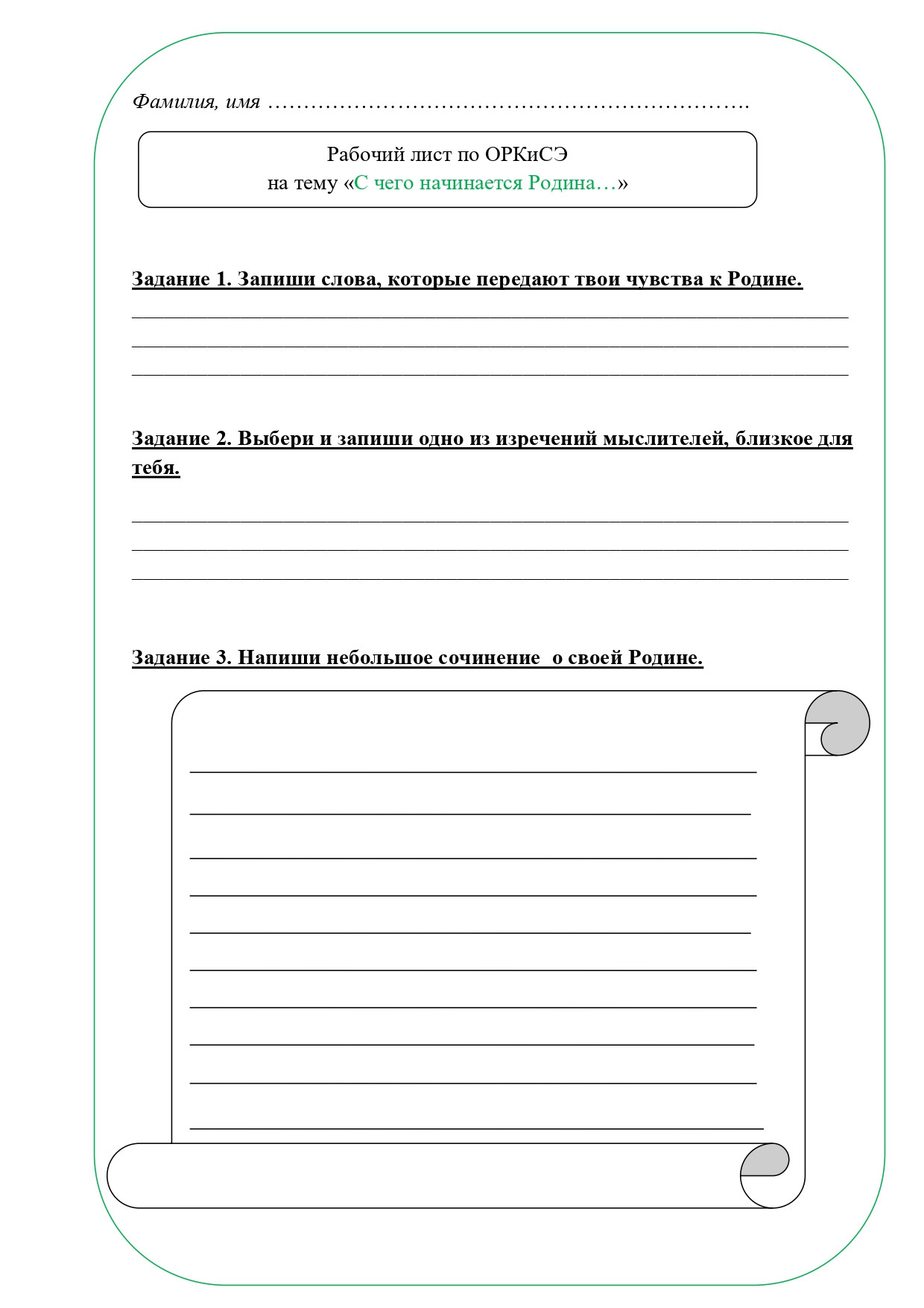 Рабочий лист по теме "С чего начинается Родина...", ОРКСЭ, 4 класс. По учебнику А. И. Шемшуриной, модуль "Основы светской этики", 2014 год. Методическая разработка подойдет для учителей, преподающих курс ОРКСЭ в 4 классе начальной школы. Данный рабочий лист предназначен для организации деятельности учащихся на уроке, поможет лучше усвоить новый учебный материал или же проверить уровень усвоения материала. Рабочий лист может использоваться при повторении и обобщении изученного, усвоении нового материала и его закреплении. В рабочий лист включены различные типы заданий, помогающие школьникам усвоить основные моменты темы. Приложены ответы на задания. Рабочий лист "С чего начинается Родина..." разработан в соответствии с темой урока.