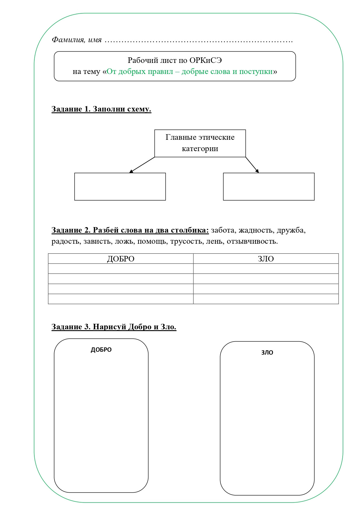 Рабочий лист по теме "От добрых правил - добрые слова и поступки", ОРКСЭ, 4 класс. По учебнику А. И. Шемшуриной, модуль "Основы светской этики", 2014 год. Методическая разработка подойдет для учителей, преподающих курс ОРКСЭ в 4 классе начальной школы. Данный рабочий лист предназначен для организации деятельности учащихся на уроке, поможет лучше усвоить новый учебный материал или же проверить уровень усвоения материала. Рабочий лист может использоваться при повторении и обобщении изученного, усвоении нового материала и его закреплении. В рабочий лист включены различные типы заданий, помогающие школьникам усвоить основные моменты темы. Приложены ответы на задания. Рабочий лист "От добрых правил - добрые слова и поступки" разработан в соответствии с темой урока.