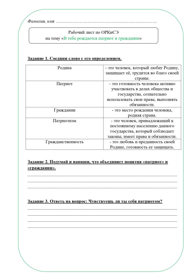 Рабочий лист по теме "В тебе рождается патриот и гражданин", ОРКСЭ, 4 класс. По учебнику А. И. Шемшуриной, модуль "Основы светской этики", 2014 год. Методическая разработка подойдет для учителей, преподающих курс ОРКСЭ в 4 классе начальной школы. Данный рабочий лист предназначен для организации деятельности учащихся на уроке, поможет лучше усвоить новый учебный материал или же проверить уровень усвоения материала. Рабочий лист может использоваться при повторении и обобщении изученного, усвоении нового материала и его закреплении. В рабочий лист включены различные типы заданий, помогающие школьникам усвоить основные моменты темы. Приложены ответы на задания. Рабочий лист "В тебе рождается патриот и гражданин" разработан в соответствии с темой урока.