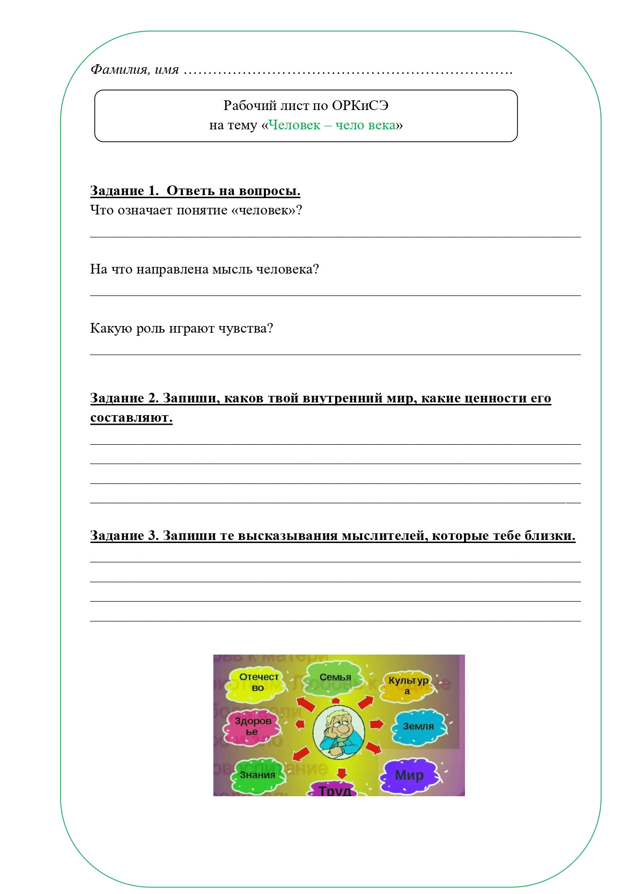 Рабочий лист по теме "Человек - чело века", ОРКСЭ, 4 класс. По учебнику А. И. Шемшуриной, модуль "Основы светской этики", 2014 год. Методическая разработка подойдет для учителей, преподающих курс ОРКСЭ в 4 классе начальной школы. Данный рабочий лист предназначен для организации деятельности учащихся на уроке, поможет лучше усвоить новый учебный материал или же проверить уровень усвоения материала. Рабочий лист может использоваться при повторении и обобщении изученного, усвоении нового материала и его закреплении. В рабочий лист включены различные типы заданий, помогающие школьникам усвоить основные моменты темы. Приложены ответы на задания. Рабочий лист "Человек - чело века" разработан в соответствии с темой урока.