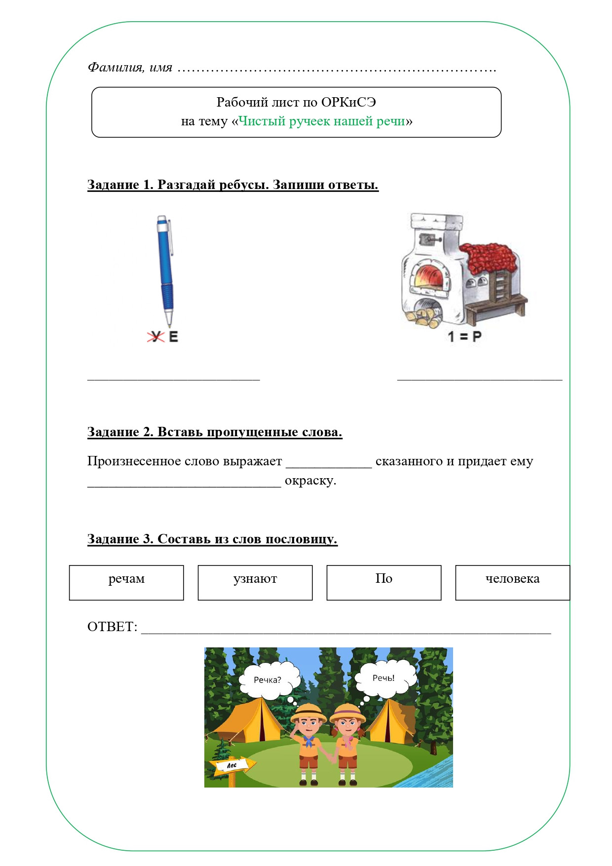 Рабочий лист по теме "Чистый ручеек нашей речи", ОРКСЭ, 4 класс. По учебнику А. И. Шемшуриной, модуль "Основы светской этики", 2014 год. Методическая разработка подойдет для учителей, преподающих курс ОРКСЭ в 4 классе начальной школы. Данный рабочий лист предназначен для организации деятельности учащихся на уроке, поможет лучше усвоить новый учебный материал или же проверить уровень усвоения материала. Рабочий лист может использоваться при повторении и обобщении изученного, усвоении нового материала и его закреплении. В рабочий лист включены различные типы заданий, помогающие школьникам усвоить основные моменты темы. Приложены ответы на задания. Рабочий лист "Чистый ручеек нашей речи" разработан в соответствии с темой урока.