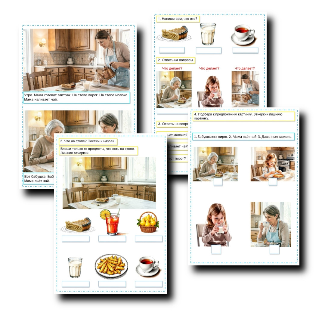 Отработать предикативную лексику (ест, пьёт, наливает).