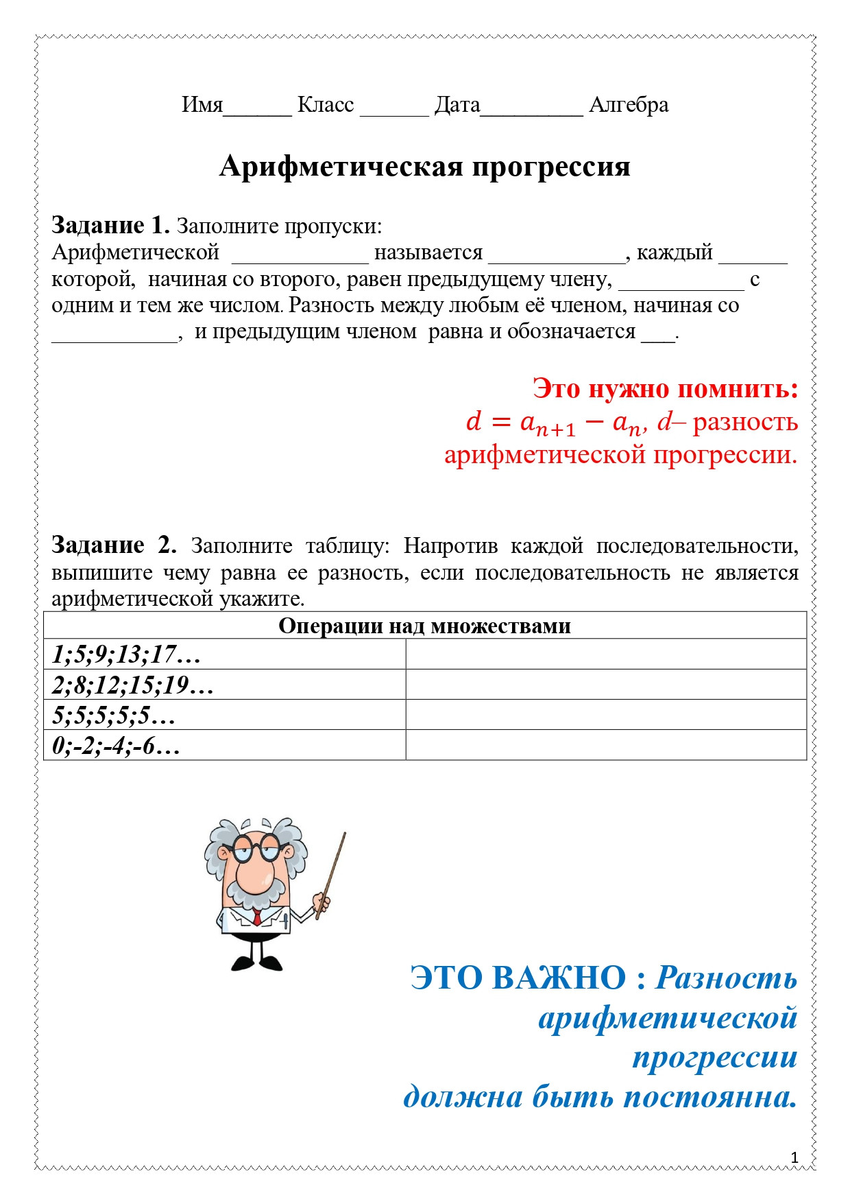Рабочий лист по теме "Арифметическая прогрессия". На все задания представлены ответы. Позволит разнообразить виды деятельности на уроке.