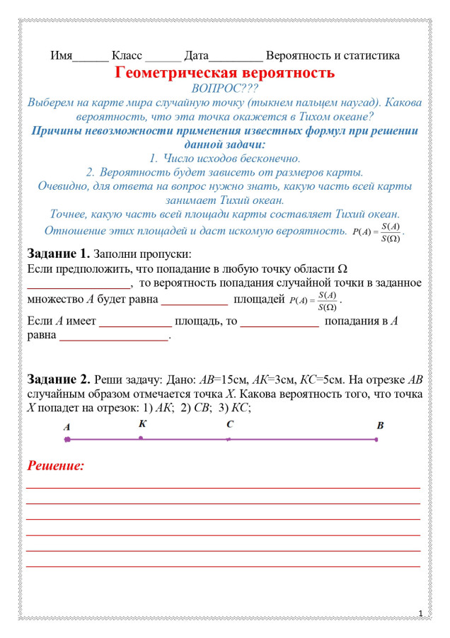 Рабочий лист по теме "Геометрическая вероятность". Данный рабочий лист содержит разнообразные задания и ответы к ним. Разнообразит виды деятельности на уроке, позволит проверить пробелы по данной теме. Можно использовать как в классе, так и в качестве домашнего задания.