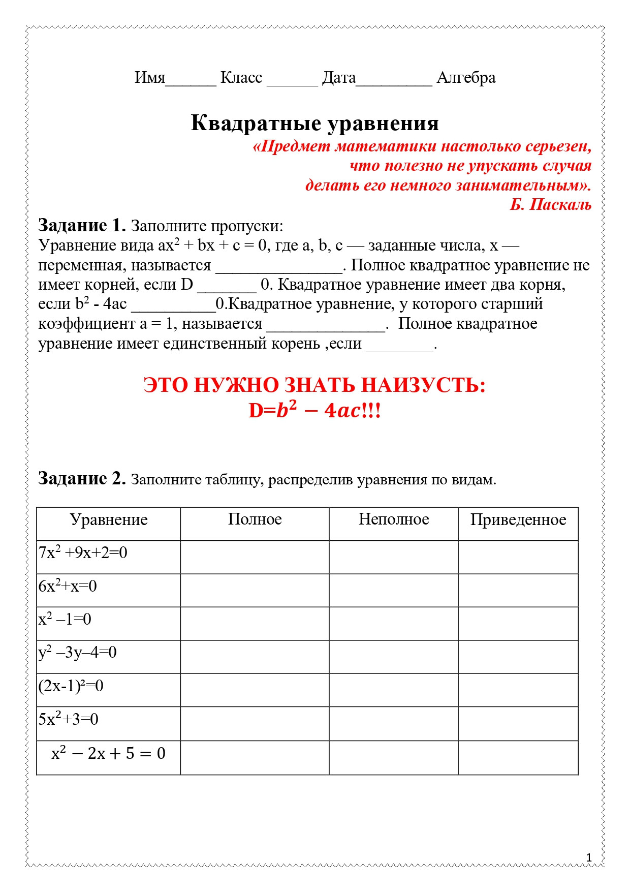 Рабочий лист по теме "Квадратные уравнения". На все задания содержит ответы. Разнообразит виды деятельности на уроке.