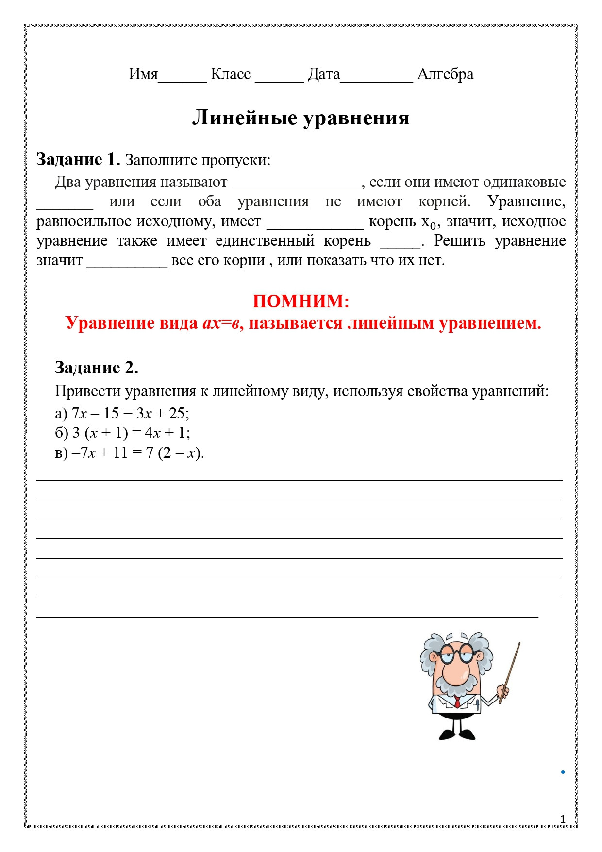 Рабочий лист по теме "Линейные уравнения". На все задания содержит ответы. Разнообразит виды деятельности на уроке.