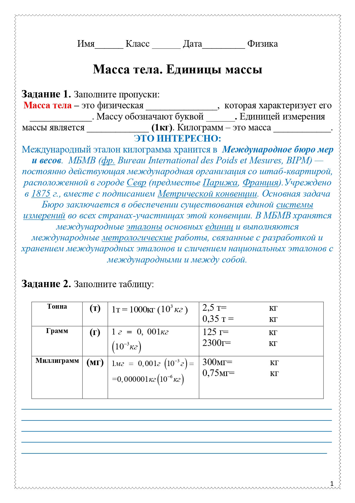 Рабочий лист по теме "Масса тела". На все задания содержит ответы.