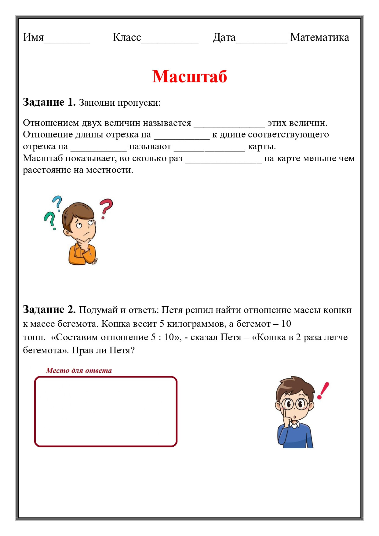 Рабочий лист по теме "Масштаб". На все задания представлены ответы.