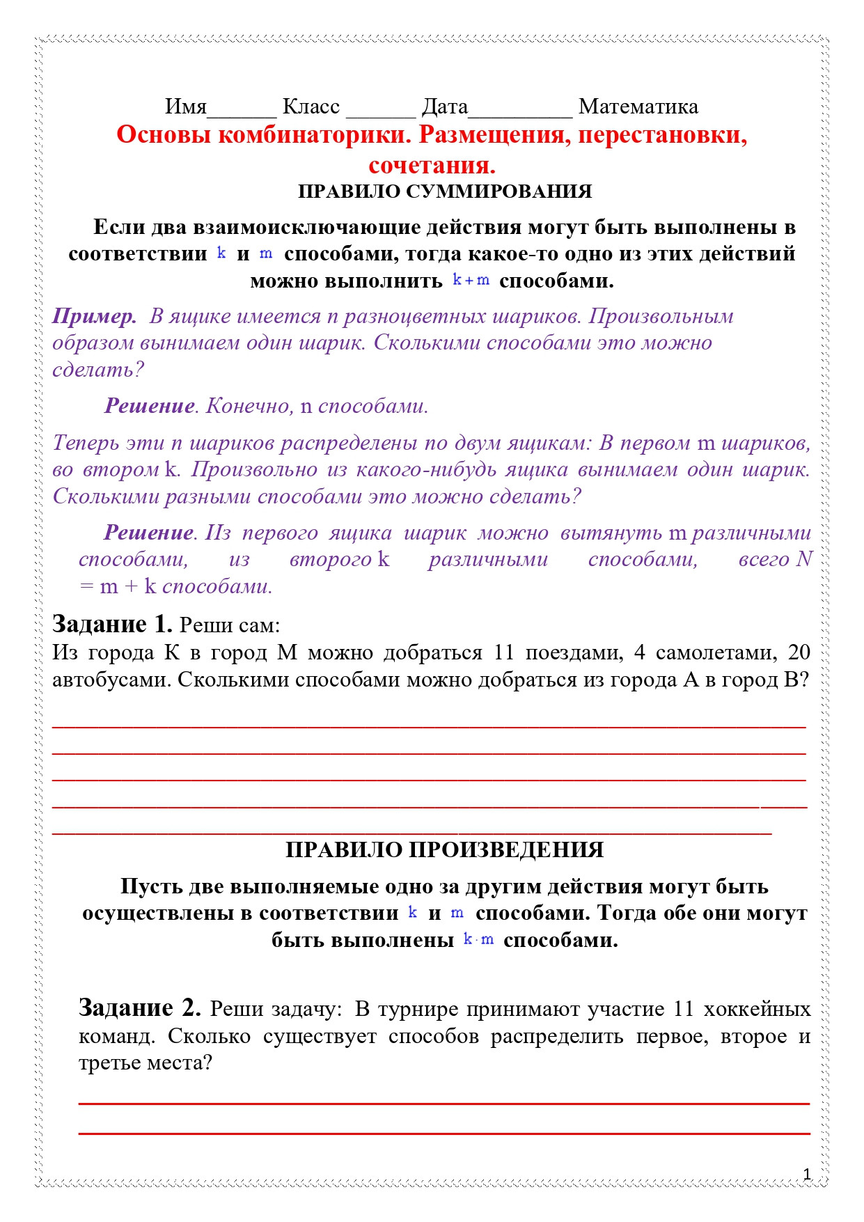 Рабочий лист по теме "Основы комбинаторики. Размещения, перестановки, сочетания". На все задания содержит ответы.