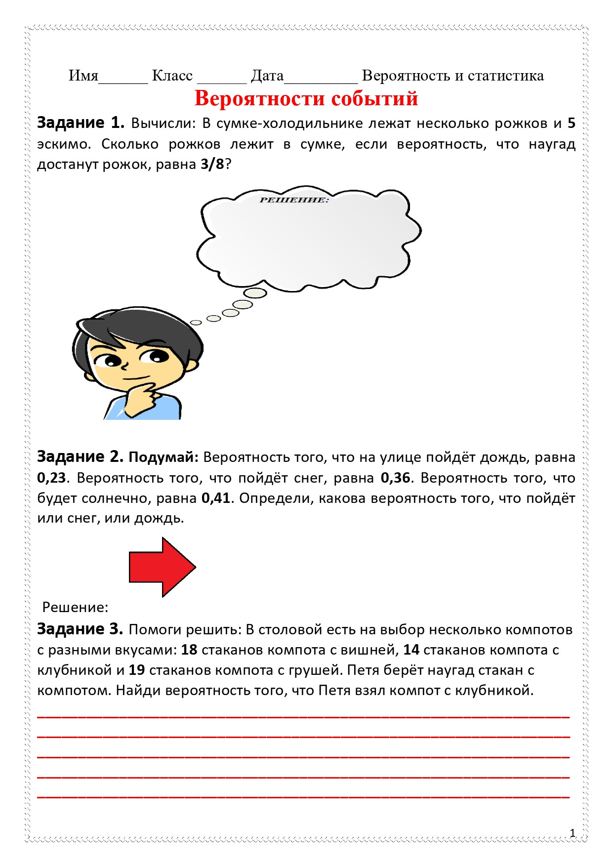Рабочий лист по теме "Вероятность событий". На все задания представлены ответы. Можно использовать как на уроке, так и в качестве домашнего задания.