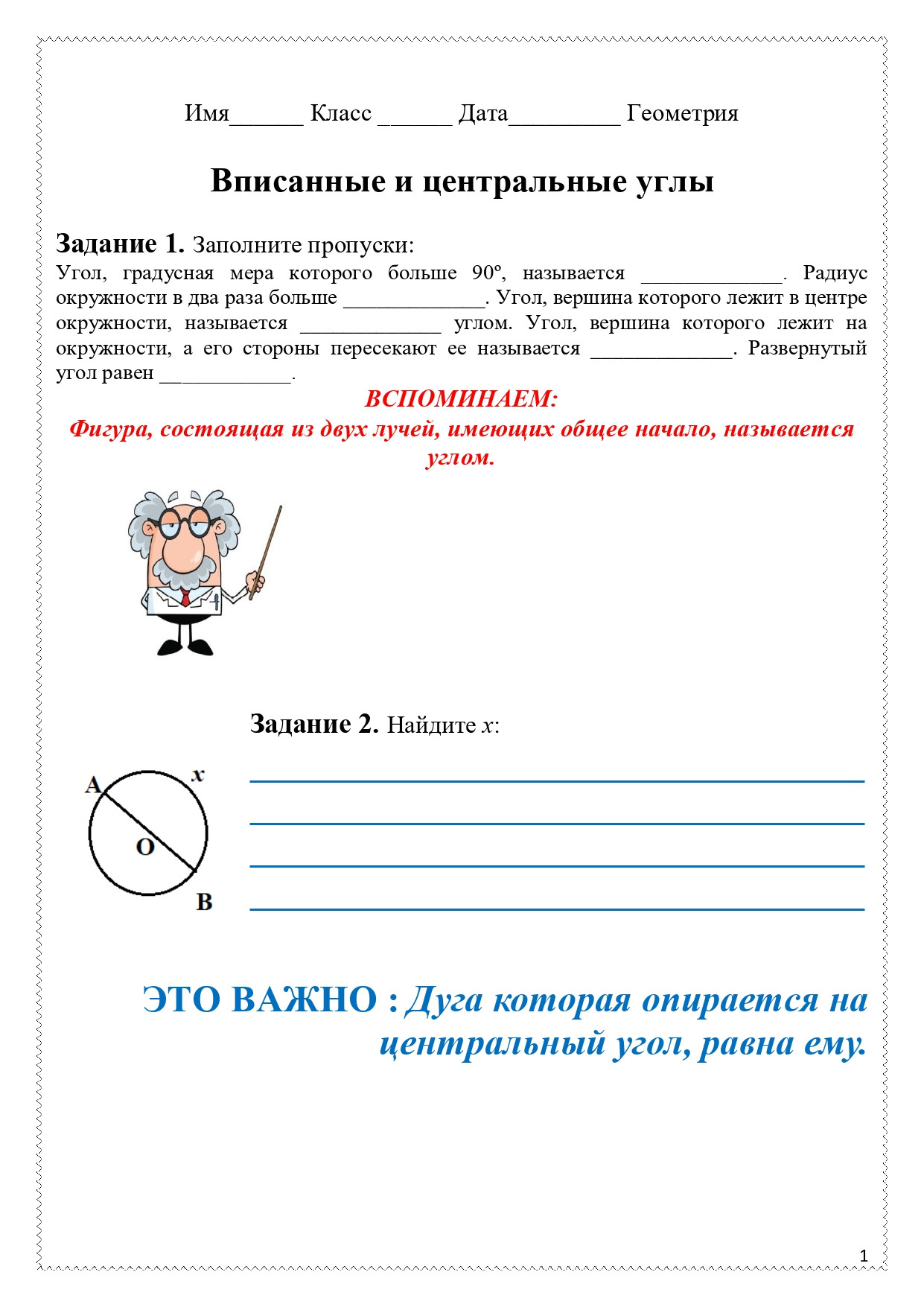 Рабочий лист по теме "Вписанные и центральные углы". На все задания представлены ответы. Разнообразит виды деятельности на уроке.