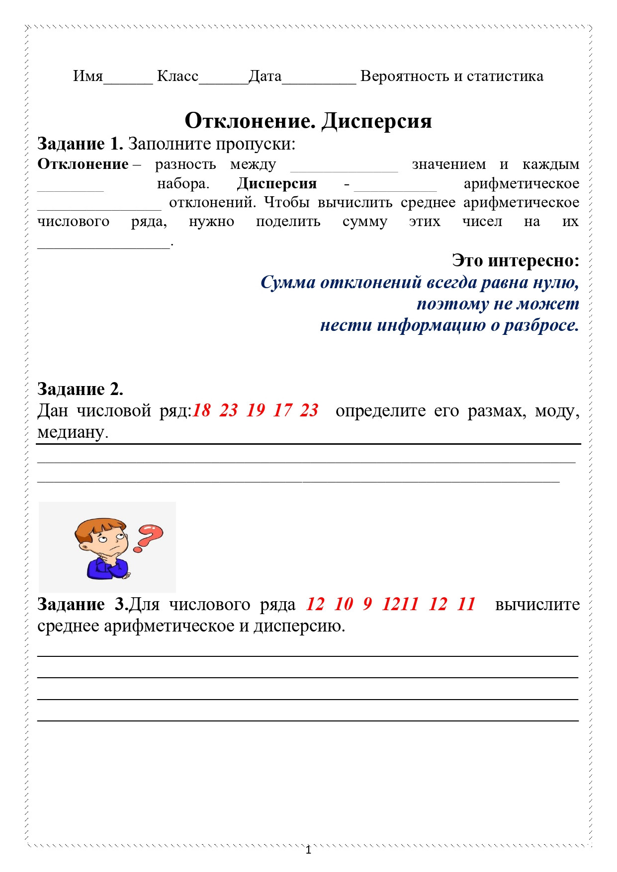 Рабочий лист по вероятности и статистике "Дисперсия. Отклонение." Содержит разнообразные задания, на которые представлены ответы. Позволит разнообразить виды деятельности на уроке.